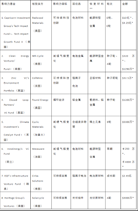 事实上,影响力投资已出现在能源转型矿产回收领域,本文选出8个代表性案例,将基金名称、被投资方、影响力目标、回收品、恢复材料、融资轮次等信息做了梳理,示于表1。