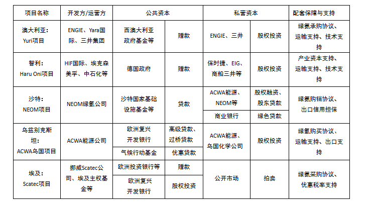 在资金来源方面,国际项目并不凭靠单一来源,而是揉和多方来源资金,形成“公私合营+产业联盟”模式。公共资本主要来自政府和开发金融机构,私营资本主要来自商业银行、能源巨头(如ENGIE),或是上下游企业(如保时捷)的产业资本。在此,公共资本通过赠款或优惠贷款形成催化资金,吸收市场风险,从而撬动私营资本参与。其中,产业资本具有多方功能,同时扮演资金提供者、能源技术提供者、产品承购方、下游市场开拓者等角色。